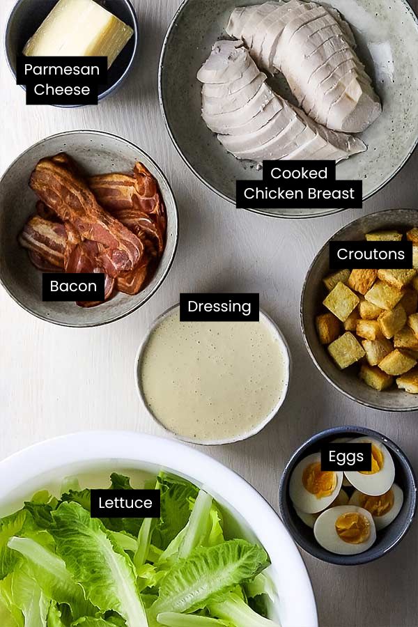- Transfer the lettuce to a serving bowl or platter. Top with the chicken and eggs, then scatter bacon and croutons over the top. Sprinkle with extra parmesan and serve with extra dressing on the side for those who like it saucy.3 slices bread, 1 lb chicken breasts, 5 oz streaky bacon, 4 eggs, parmesan cheese