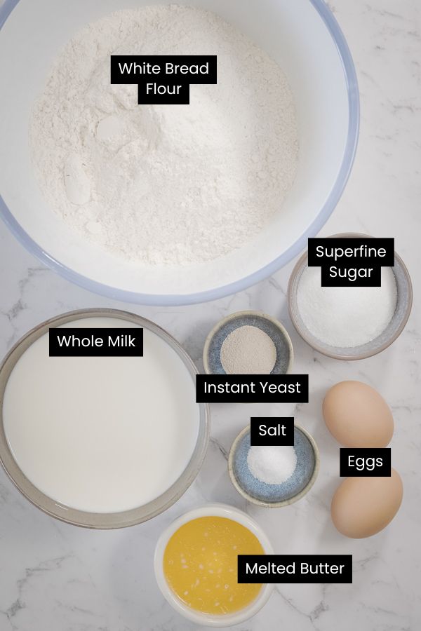 - Put all of the dough ingredients into the bowl of a stand mixer fitted with a dough hook, and mix on low speed until a smooth and elastic dough forms, about 7-8 minutes. The dough will be a little tacky but you should be able to touch it and stretch it a little without it sticking to your fingers. If it's too wet, add up to an extra 1/3 cup flour.2 tsp instant yeast, 1½ cups whole milk, ¼ cup superfine sugar, 5 tbs unsalted butter, 2 eggs, 1 tsp salt, 5 cups white bread flour