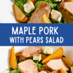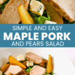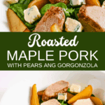 - Rest the pork for a few minutes while you put the salad together. Put the leaves onto a large platter and arrange the pears on top. Slice the pork into pieces approximately 6mm/¼” thick and lay these over the top. Pour any pan juices over the salad, scatter with the gorgonzola and serve immediately.
