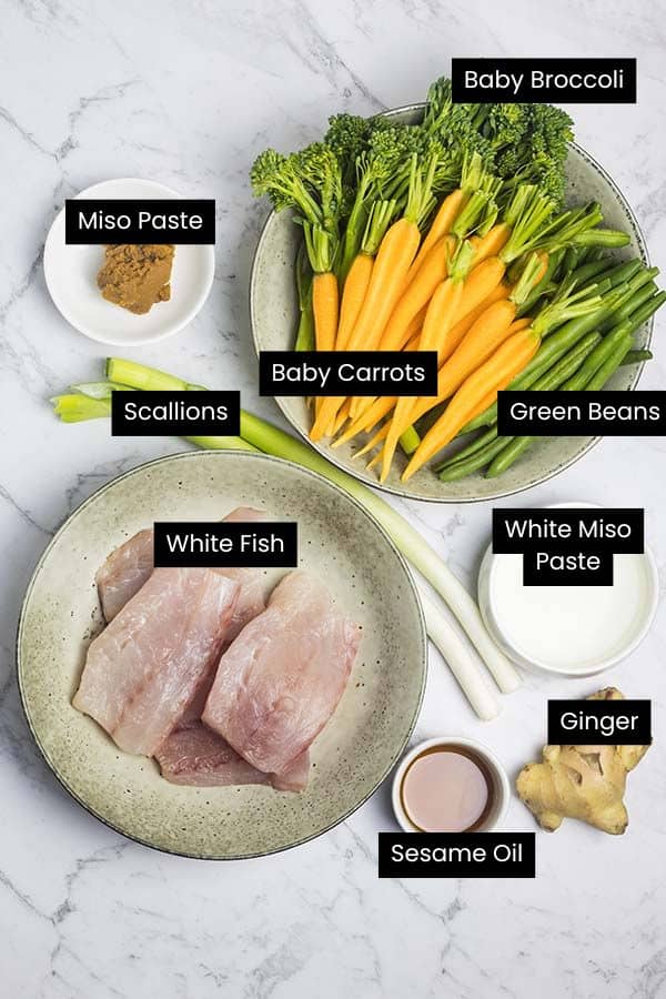 Today I’m giving you directions for a version using white fish, carrots, baby broccoli and beans, with an Asian-inspired miso and ginger dressing. Once you’ve mastered that, though, you can try it with all sorts of different vegetables and flavor combinations. Salmon on a bed of spinach and cherry tomatoes is lovely, dressed with lemon and herbs or a dot of garlic butter. Or you could give your fish an Indian flair by rubbing it with curry paste before cooking and adding a touch of coconut milk to each parcel.