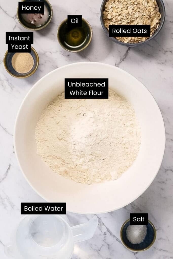 - Put the oats in the bowl of a stand mixer and pour the boiling water over the top. Leave to stand for 15 minutes.1 cup rolled oats, 2 cups boiling water