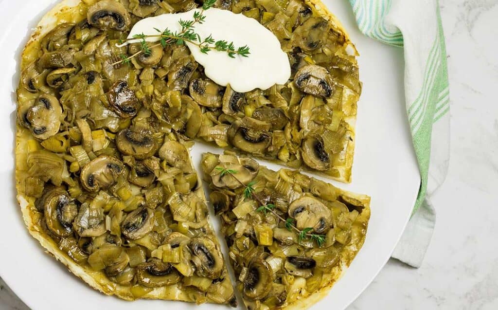 This upside-down vegetable tart is an all-year affair if you change up the vegetables (tomatoes or tiny, firm zucchinis are fabulous in summer). For cool-slash-springtime-ish weather, the leek and mushroom version is perfect; earthy and warming but not heavy.
