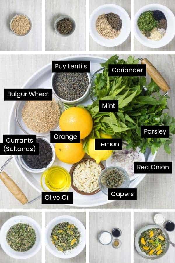The ingredient list might seem quite long but apart from a little time cooking the lentils and wheat, it’s really a very straightforward assembly job. I prepare everything as much ahead as I can, rinsing capers, toasting nuts and chopping herbs earlier in the day so when it comes time to make, I just throw everything into the bowl and mix.