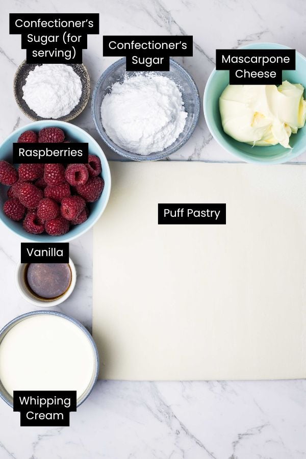 - To assemble, lay 8 of the pastry rectangles on a board and alternate dots of the mascarpone cream with the raspberries to cover. Place a second layer of pastry on top of each, then repeat the cream and raspberries before finishing with a final pastry layer. Dust the pastries with extra confectioners sugar and serve.8 oz raspberries