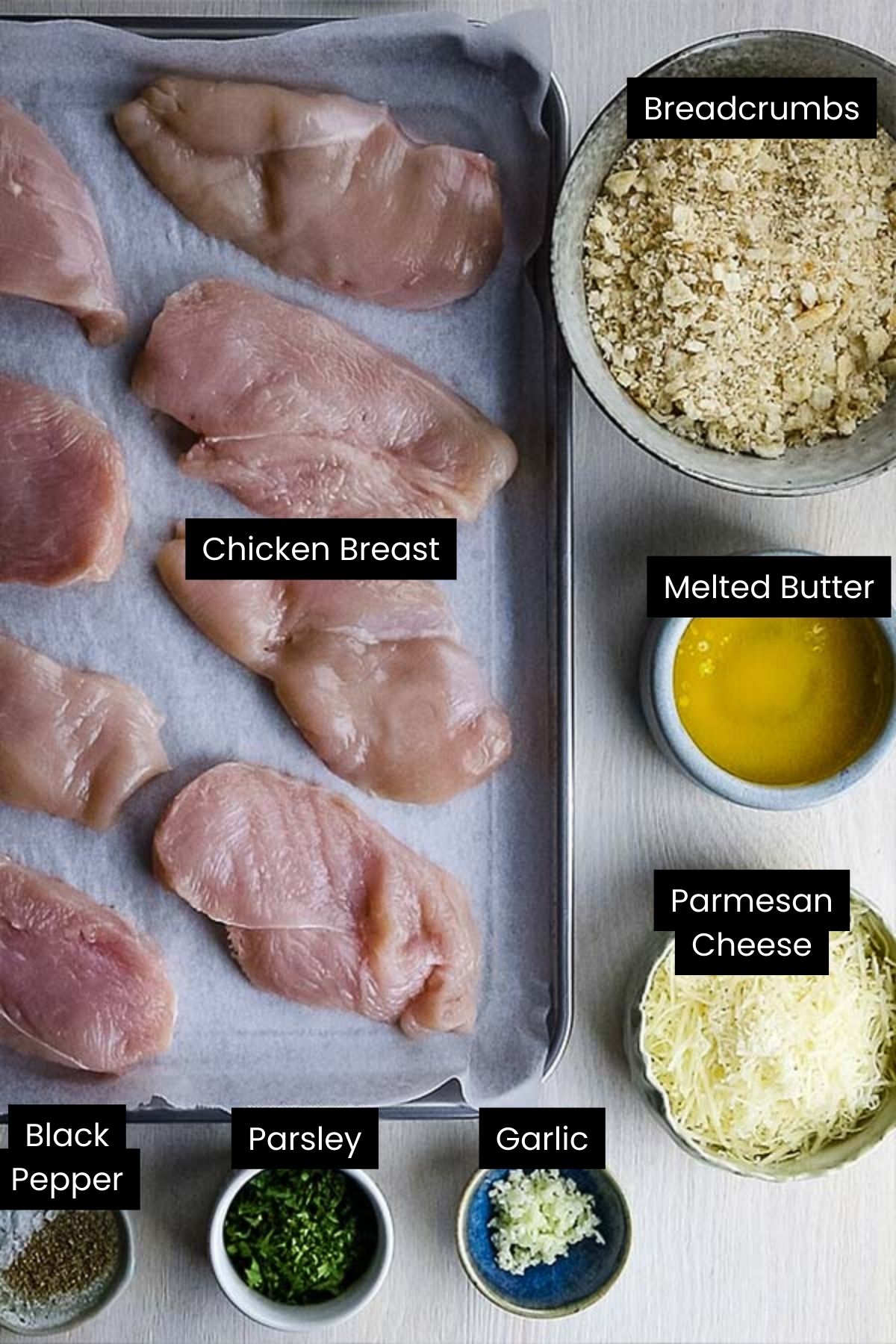 - Lay the chicken into the prepared pan and top with the breadcrumb mixture. You want to pile it on top of each fillet and then press it down slightly, without squashing the life out of it.4 chicken breasts