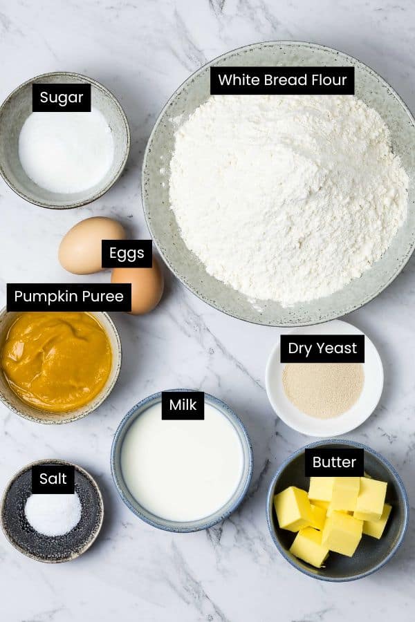 - Make the dough. Put all the ingredients into a large bowl and mix by hand or with a mixer until a soft, smooth and elastic dough forms. If you’re mixing by hand this could take up to 10 minutes, in a mixer it takes around 4-5 minutes.1 cup pumpkin puree, ¼ cup sugar, 2 tsp salt, 4 oz butter, 2 eggs, 2 tsp dry yeast, ¾ cup milk, 4¼ cups white bread flour