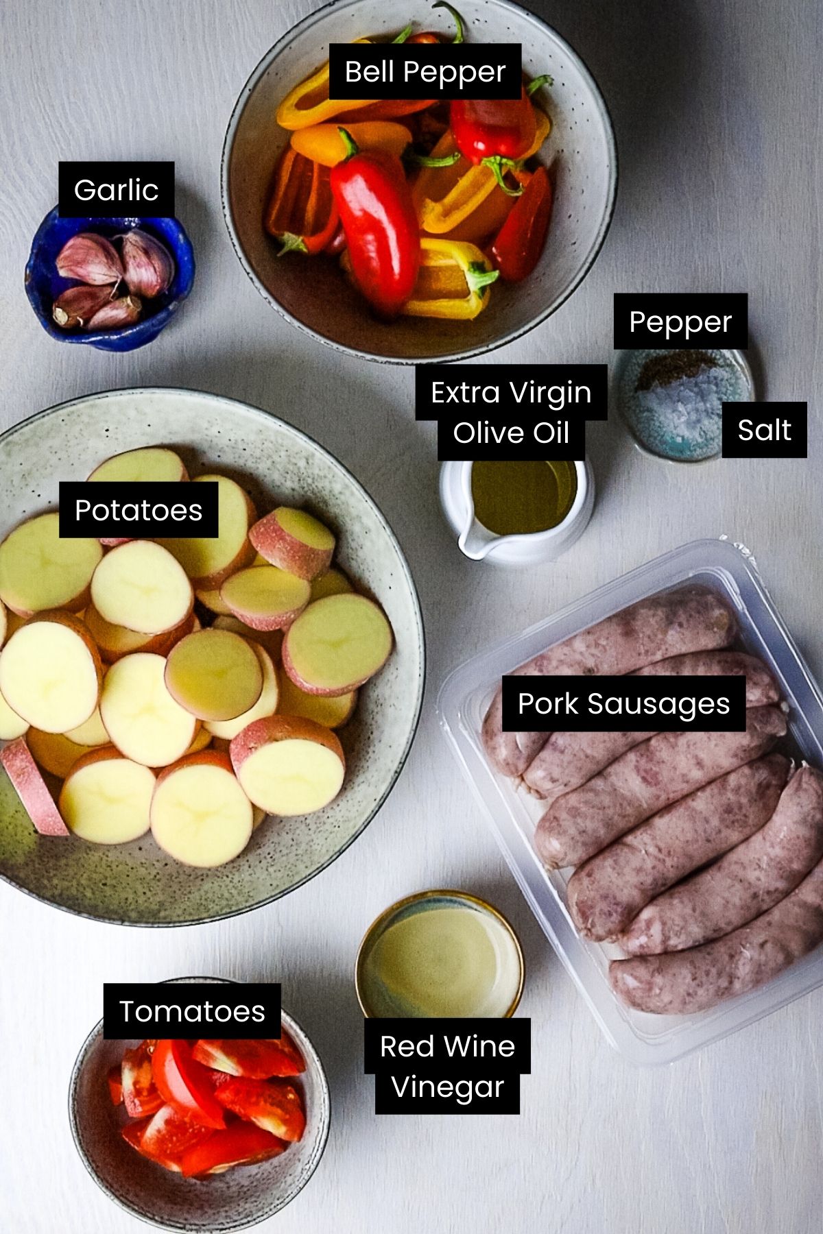 - Drizzle the vegetables with most of the oil and all of the red wine vinegar, and season well with salt and pepper. Toss gently to combine. Add the sausages to the pan, wiggling them a bit so they nestle into the vegetables. Drizzle with the remaining oil and sprinkle with salt and pepper.1/4 cup extra virgin olive oil, 1 Tbsp red wine vinegar, 6 pork sausages, 1/2 tsp salt, 1/4 tsp cracked black pepper