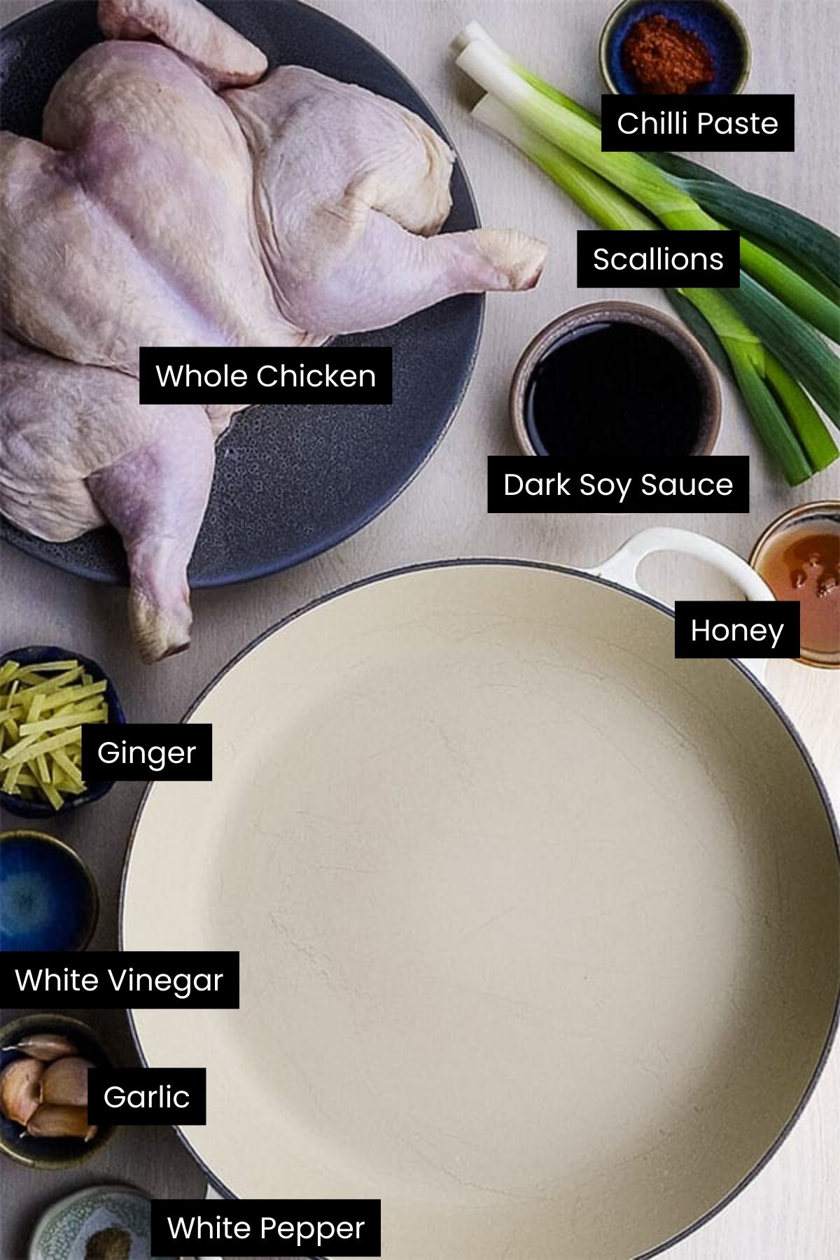 - Put the chicken into a deep baking dish, flattened out and skin side up. Mix the rest of the ingredients and pour over the chicken.3.5 lb whole chicken, โ cup dark soy sauce, 3 Tbsp honey, 1 knob ginger, 4 scallions, 4 garlic cloves, 2 Tbsp white vinegar, 1 tsp chili paste, ยฝ tsp ground white pepper