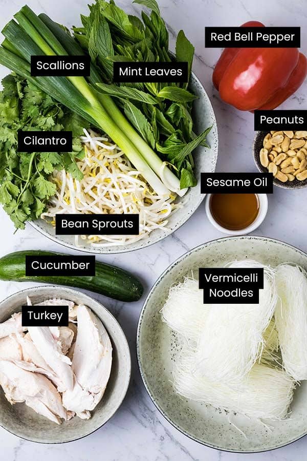 The prep for this turkey salad recipe is mostly just washing and chopping, and soaking rice noodles in hot water.