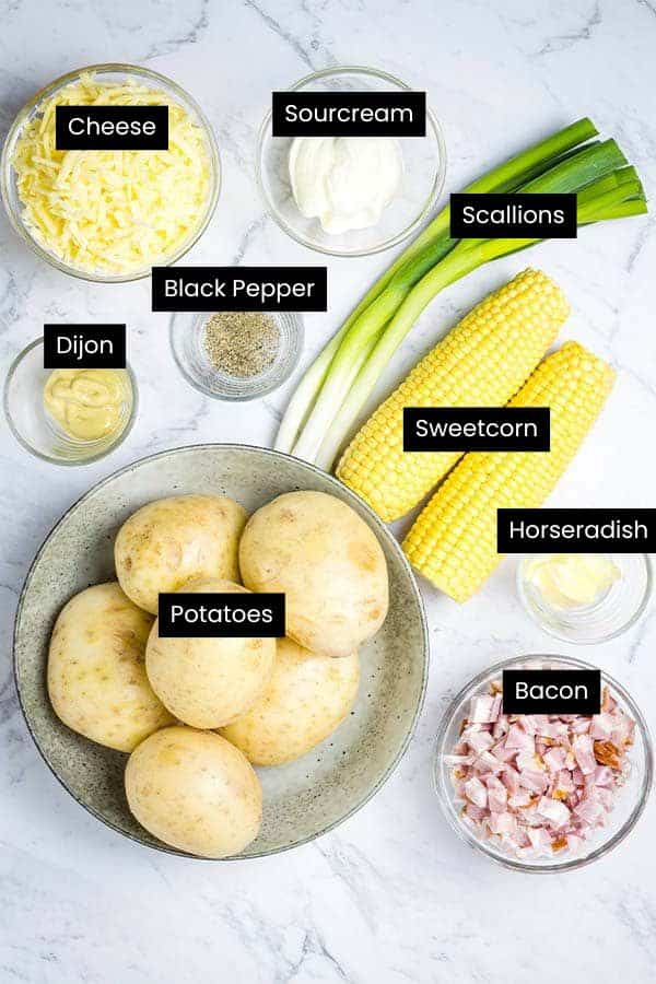 - Mash the scooped out potato flesh with the sour cream, mustard, horseradish (if using), and butter. Stir through 2/3 of the cooked bacon (reserving the rest to sprinkle over the top), the scallions and corn kernels, the season everything well with black pepper. I don’t add salt to this mixture as we find the bacon salty enough, but you do what you like.¼ cup sour cream, 2 tsp Dijon mustard, 1 tsp horseradish, 2 tbs butter, 4 scallions, 2 ears sweetcorn, Black pepper to season